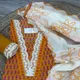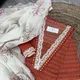 The ensemble is completed with a soft mul dupatta adorned with delicate embroidery, adding lightness and a subtle festive charm to the outfit.