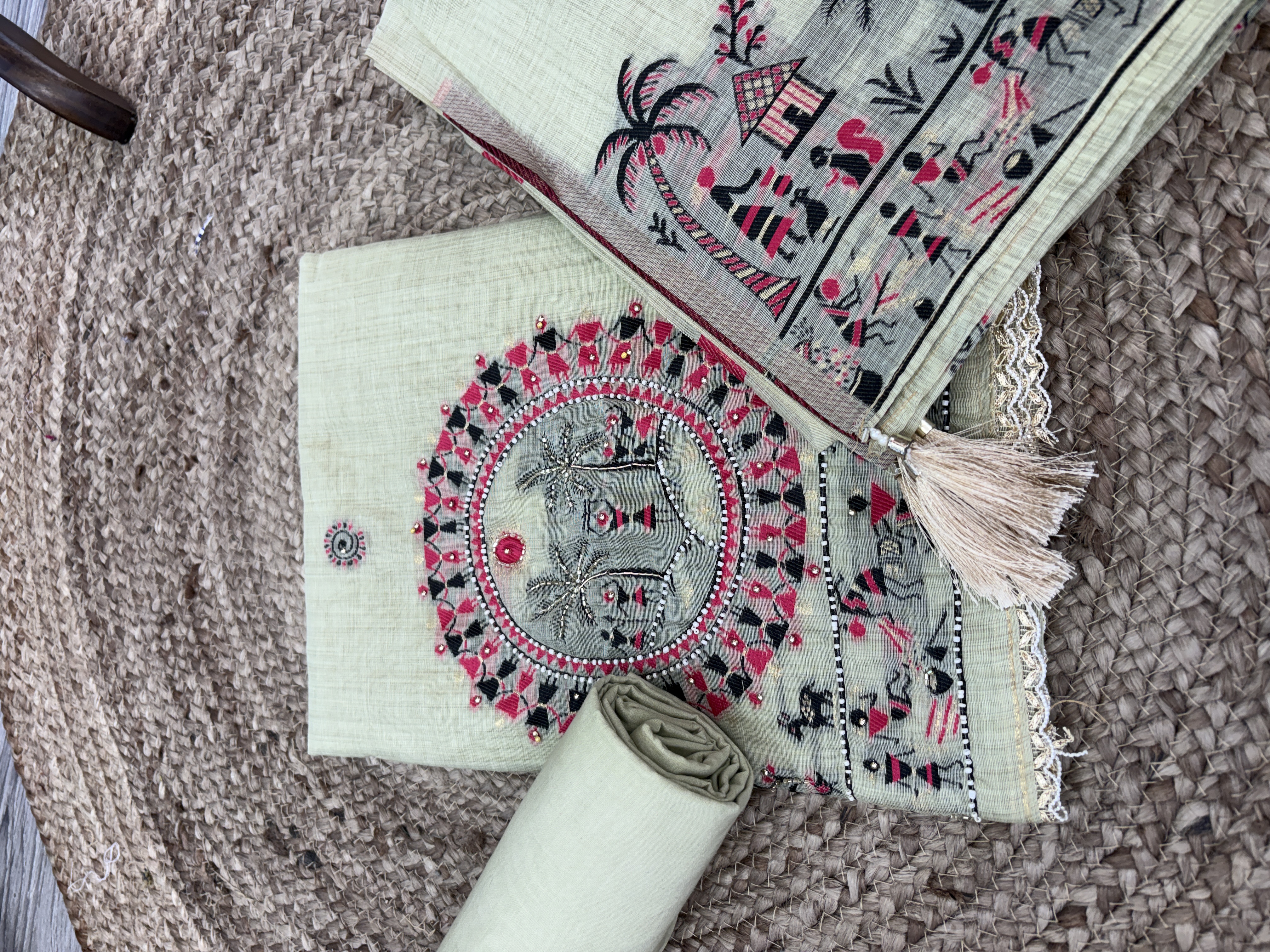 Elegant and rooted in tradition, these Jamdani cotton suit sets with dupatta bring together fine weaving and artistic embroidery in soothing pastel shades.