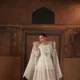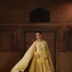 The kurta features delicate floral embroidery on the yoke, enhanced with subtle piping and tassel detailing. The flared silhouette is adorned with intricate printed panels and lace accents at the hem, adding a touch of sophistication. Paired with a lightweight mulmul cotton dupatta featuring traditional booti prints and an elegant border.