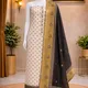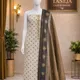 The highlight of the outfit is its rich woven dupatta, featuring a stunning contrast border with intricate motifs and traditional patterns, adding depth and luxury to the overall design.