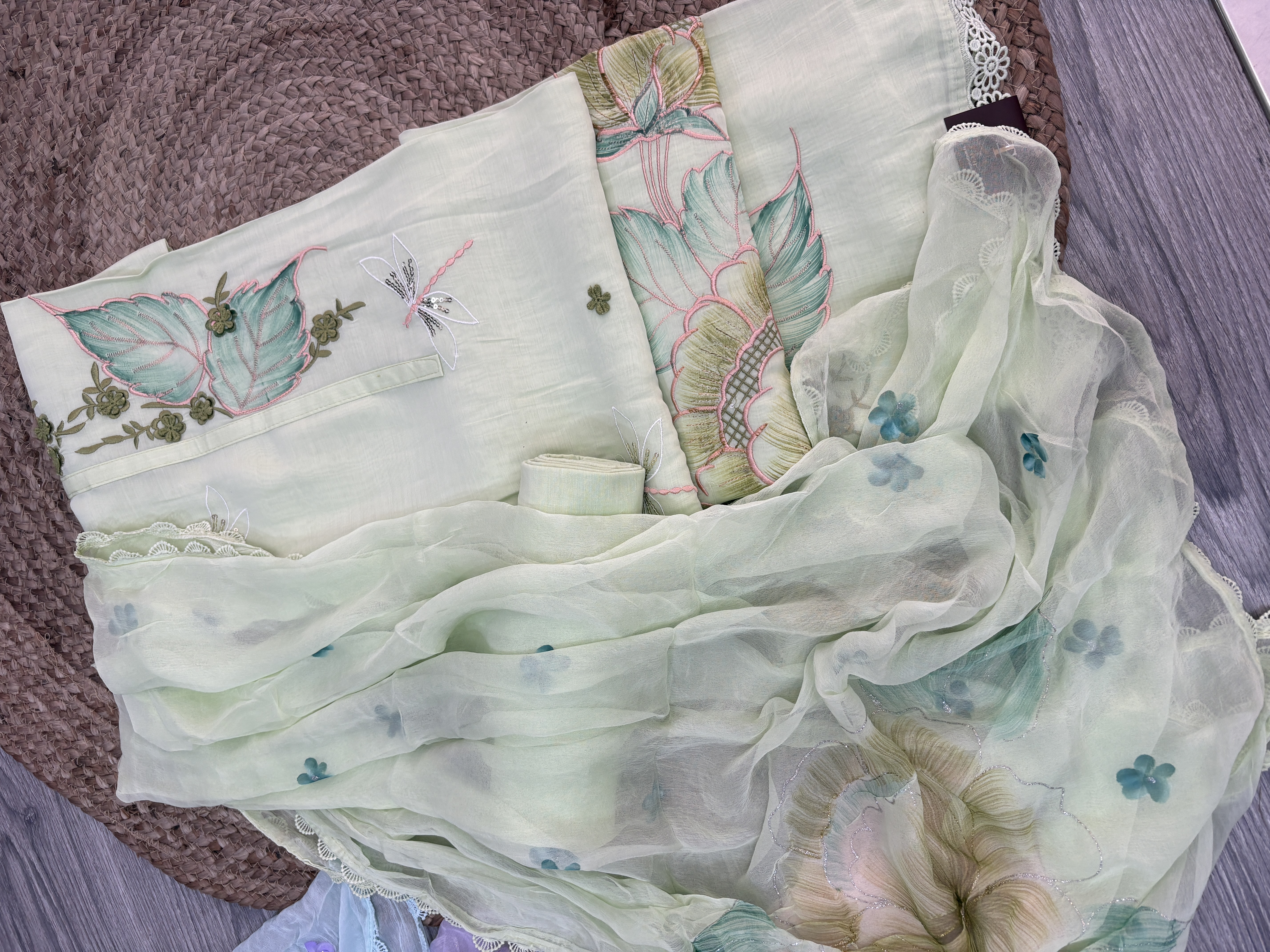 The kurta features a soothing pastel base adorned with delicate handwork embroidery, including floral motifs and fine detailing that add a subtle yet refined charm.